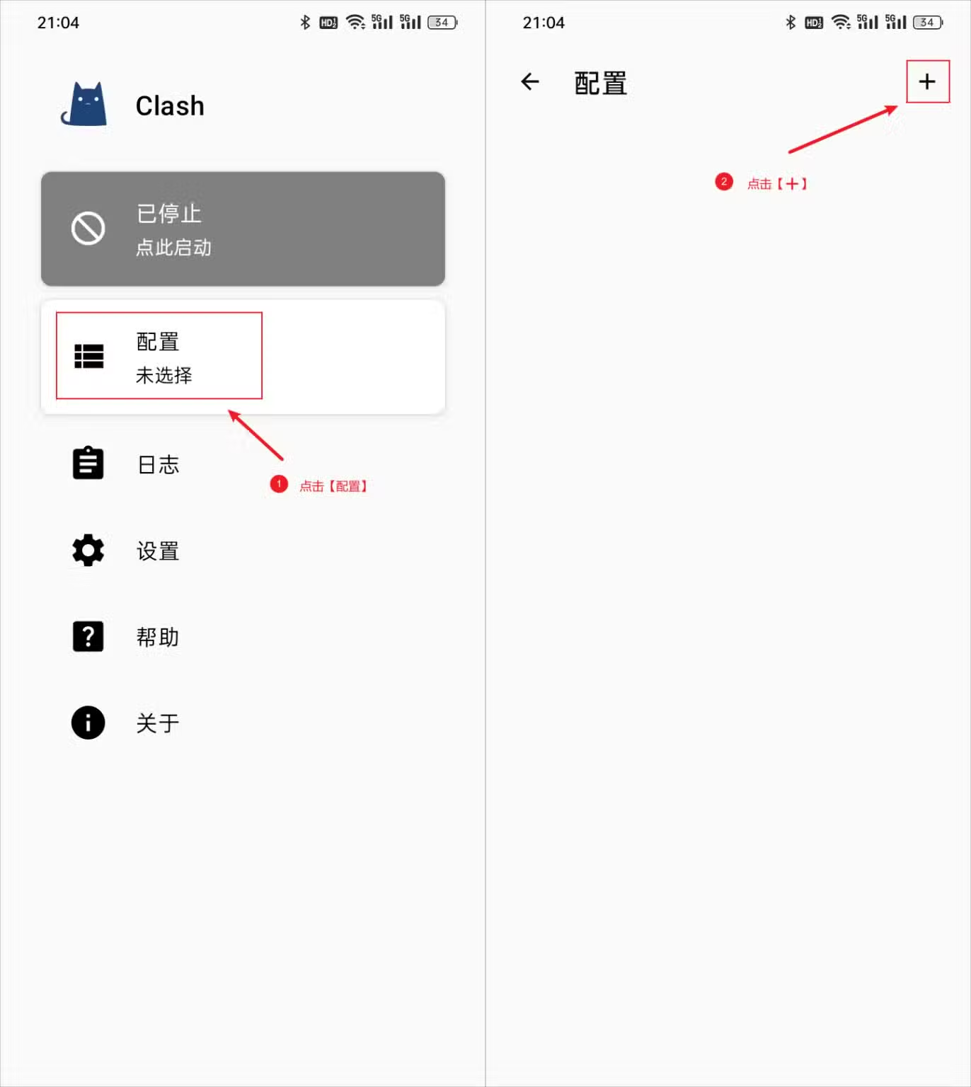 打开 Clash for Android,首次进入主界面后点击右上角 添加配置。