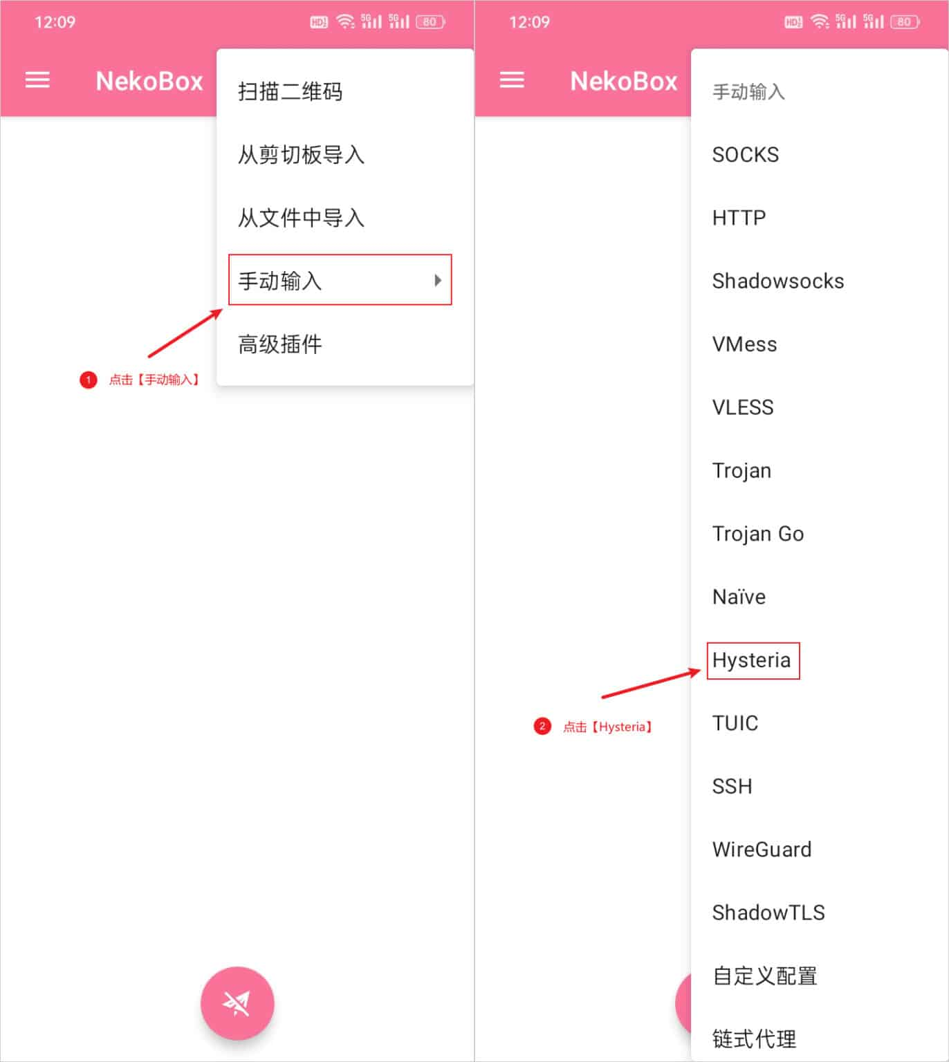 配置 Hysteria 服务器节点,通过点击软件主界面右上角的 ➕ 号按钮即可出现添加配置文件选项,选择手动输入,随后在弹出的窗口中选择 Hysteria 选项,如下图所示: