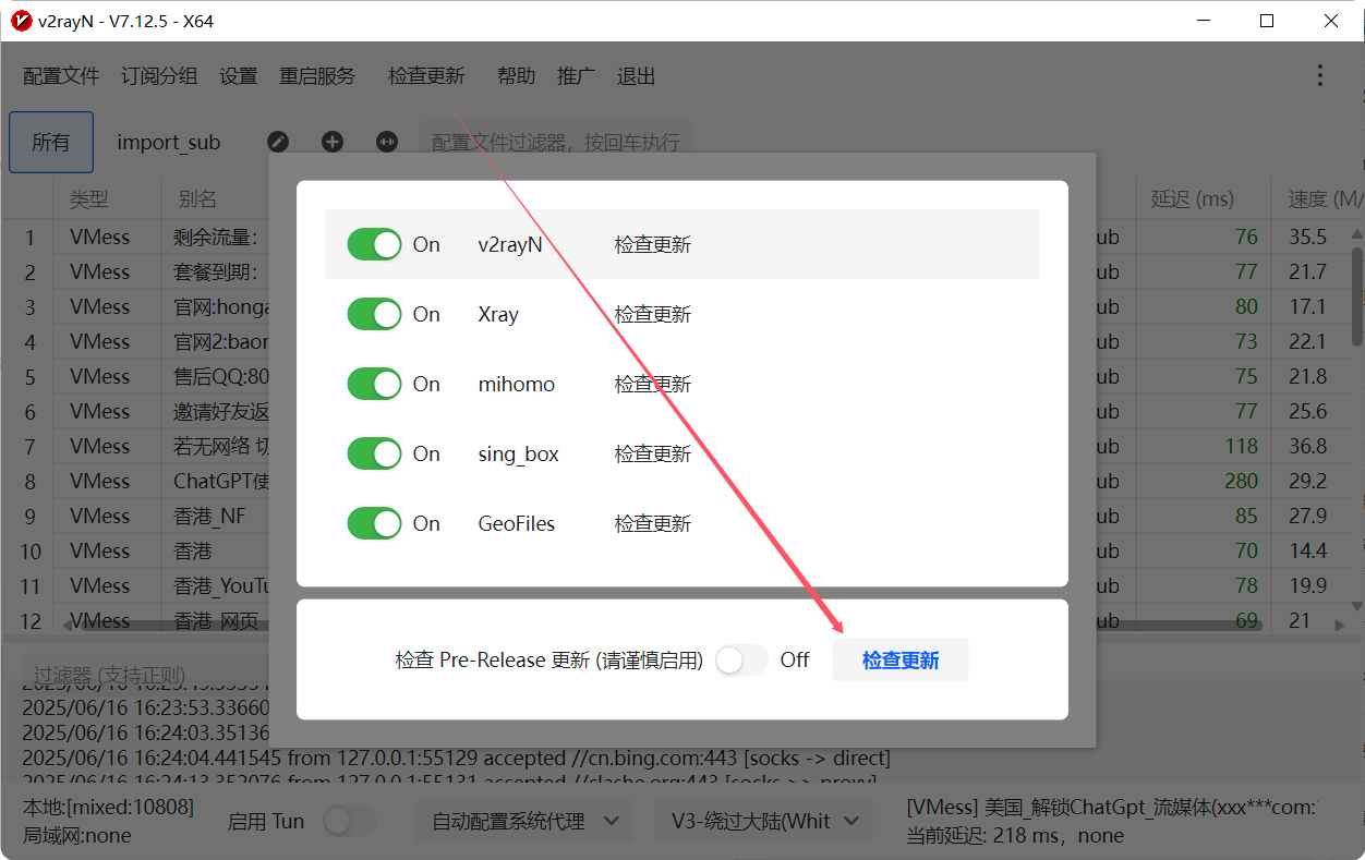 截至文章更新前 v2rayN 最新版本为v7.12.5,本站版本:v7.11.3。如果你需要最新版本可下载本站版本按照以下方式更新,然后等待客户端更新完成自动重启即可。