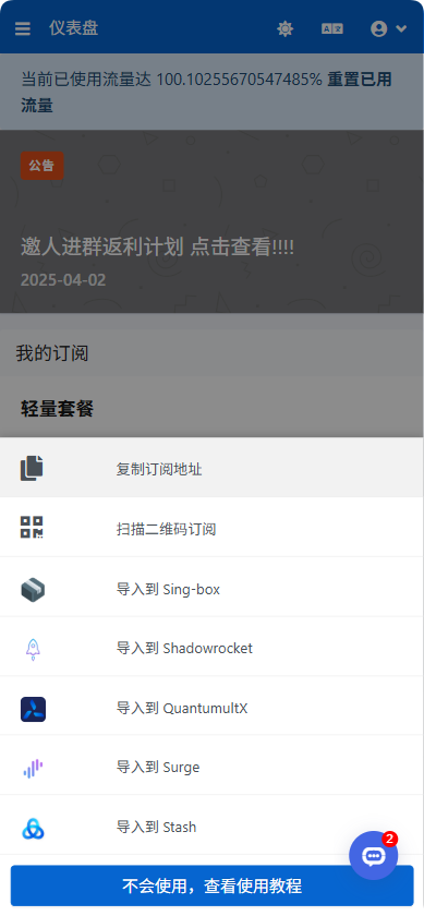 如果一键自动导入不成功,在 红岸云仪表盘 向下滑动,找到 一键订阅,点击「复制订阅地址」。